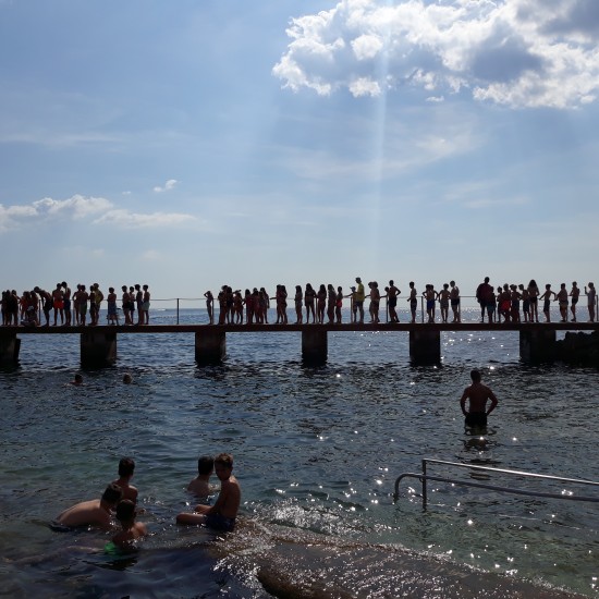“Ta veliki! pa so si medtem plažo organizirali po svoje. Kupčki prijateljstva pod senčniki, pa na pomolu, klepet, nekaj družabnih iger, malce divjanja, kopanja…