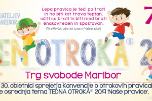 TEDEN OTROKA, 7.–11. oktober 2019, Trg svobode Prvi polni teden v oktobru se bodo povsod po Sloveniji odvijale različne delavnice, prireditve, predavanja in drugi dogodki namenjeni otrokom in zaradi otrok, ki jih organiziramo društva in zveze prijateljev mladine. V Mariboru se bomo družili na Trgu svobode, od ponedeljka, 7. oktobra, do petka, 11. oktobra, teden pa zaključili z VESELO POHORSKO SOBOTO, 12. oktobra, na Domu Miloša Zidanška na Pohorju. Ob 30. obletnici sprejetja Konvencije o otrokovih pravicah je osrednja tema TEDNA OTROKA® 2019 »Naše pravice«. ponedeljek, 15.00–18.00, od