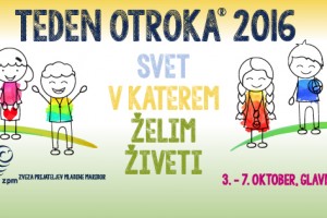 TEDEN OTROKA, 3.-7. oktober 2016 Prvi teden v oktobru se bodo povsod po Sloveniji odvijale različne delavnice, prireditve, predavanja in drugi dogodki namenjeni otrokom in zaradi otrok, ki jih organiziramo društva in zveze prijateljev mladine. Uvodni dogodek bo v Ljubljani, 30. septembra 2016 (Uvod v Teden otroka_2016), v Mariboru pa začnemo z VESELO POHORSKO SOBOTO, 1. oktobra, na Domu Miloša Zidanška na Pohorju in nadaljujemo v ponedeljek, 3. oktobra, na Glavnem trgu. Slogan TEDNA OTROKA® 2016 je Svet, v katerem želim živeti. v ponedeljek, 15.00–18.00, od torka do