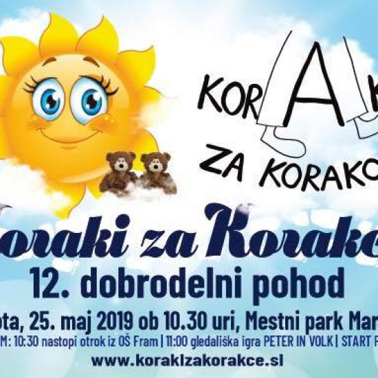 Vabljeni na 12. dobrodelni pohod Koraki za korakce, ki bo v soboto, 25. maja 2019, ob 10.30, v Mestnem parku v Mariboru. Za kulturni program pred začetkom teka bodo poskrbeli otroci iz OŠ Fram, ob 11.00 pa se bo začela gledališka predstava Peter in volk.