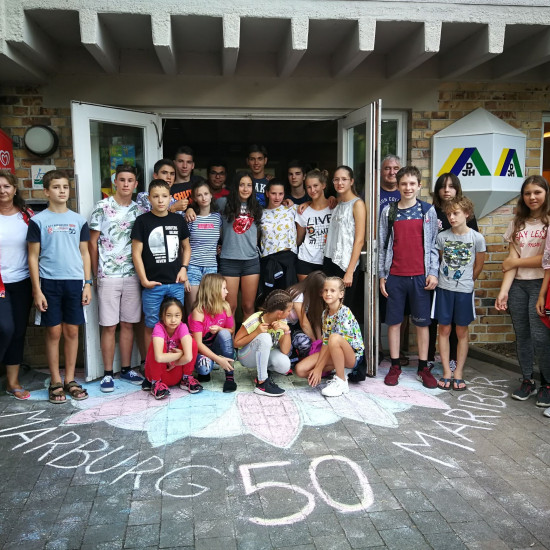 … je bil zelo naporen, saj smo se po nočni vožnji, ko nas je skoraj vso pot spremljal dež, zjutraj ustavili v Hanau. Ogledali smo si tržnico, kjer je tudi kip bratov Grimm in se sprehodili po delčku pravljične poti, ki se začne prav v Hanau. Ob 10:40 smo prispeli v JH Marburg, se nastanili v sobe, šli na kosilo in malo počivali. Nato smo se z avtobusom odpeljali do Elizabtine cerkve, kjer nam je vodnica povedala zanimivosti o cerkvi ter nas skozi mesto po kamniti poti popeljala vse do gradu. Nato pa peš domov, na večerjo in po večerji še skok v kopališče, ki je bilo samo naše. Fotk iz kopališča žal nimamo, saj je fotografiranje tam prepovedano. Ura je že pozna, v domu je tišina, utrujeni smo zaspali z mislijo na dom in na zanimive dogodivščine v današnjem dnevu. Jutri nas čakajo ves dan športne aktivnosti- plezanje v Stadtwaldu in veslanje s kanuji po reki Lahni. Zvečer pa spoznavni večer in praznovanje Stellinega rojstnega dne.
