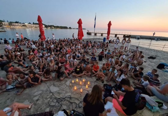 Za nami je sreda, sicer drugi dan, a prvi tak, čisto tapravi, cel. Od jutra do noči. Dopoldne smo čas namenili spoznavanju plaže in preverjanju plavanja, prvim kepicam sladoleda, kopanju in klepetanju. Na delavnicah, ki letos potekajo nekoliko drugače, so naše “družinice” (skupnosti otrok, ki bolj intenzivno bivajo skupaj) pletle zapestnice, ustvarjale iz papirja, streljale z zračno puško, igrale košarko, spoznavale VIRC in še in še.